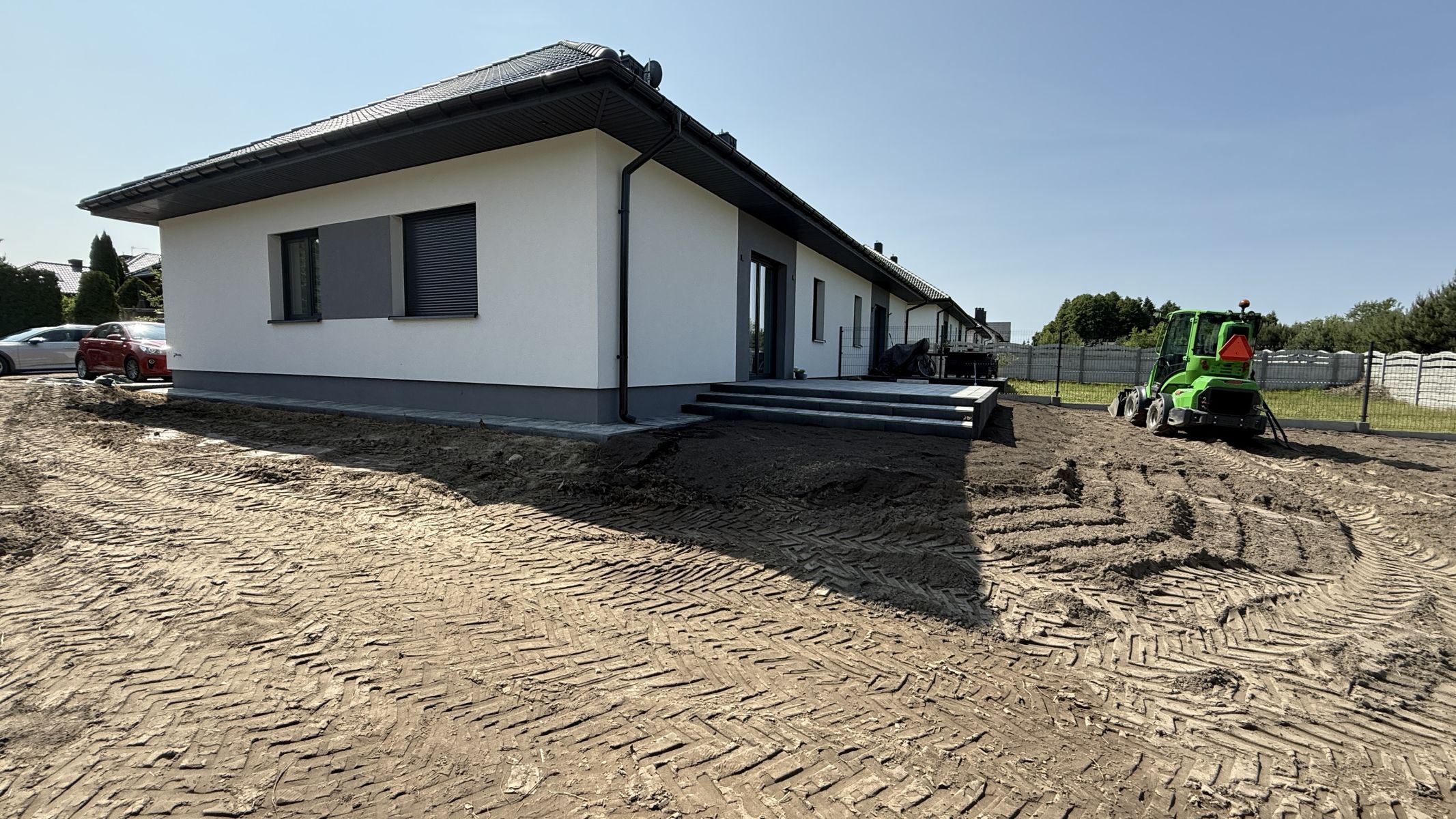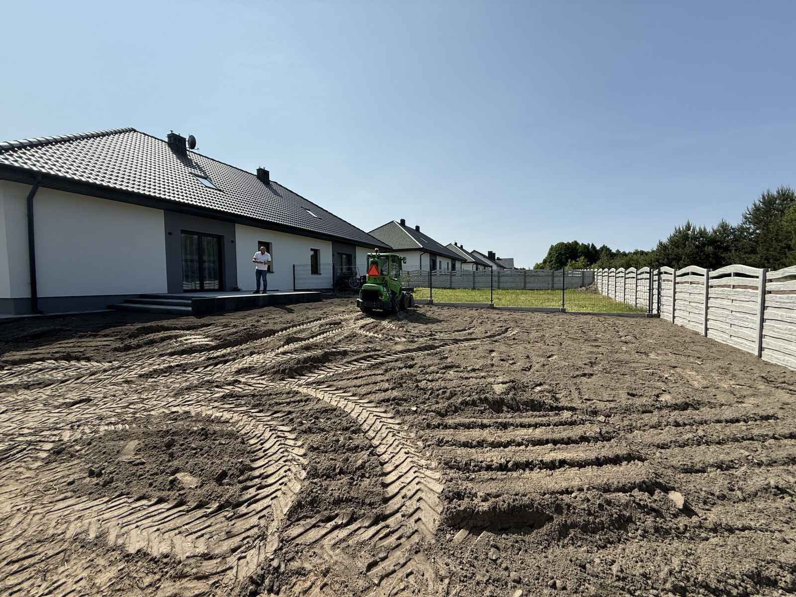 Plantowanie terenu i wyrównanie gruntu wokół nowego domu jednorodzinnego, przygotowanie działki pod trawnik i dalsze prace ogrodowe