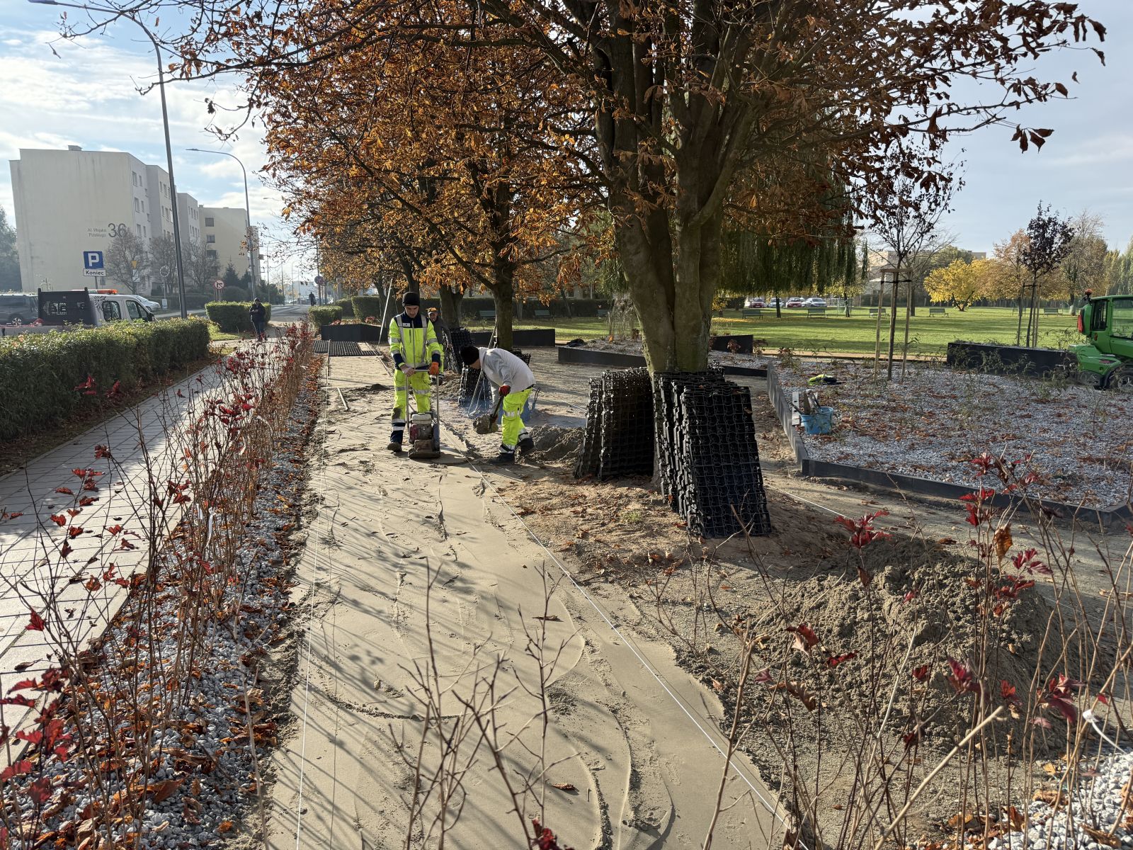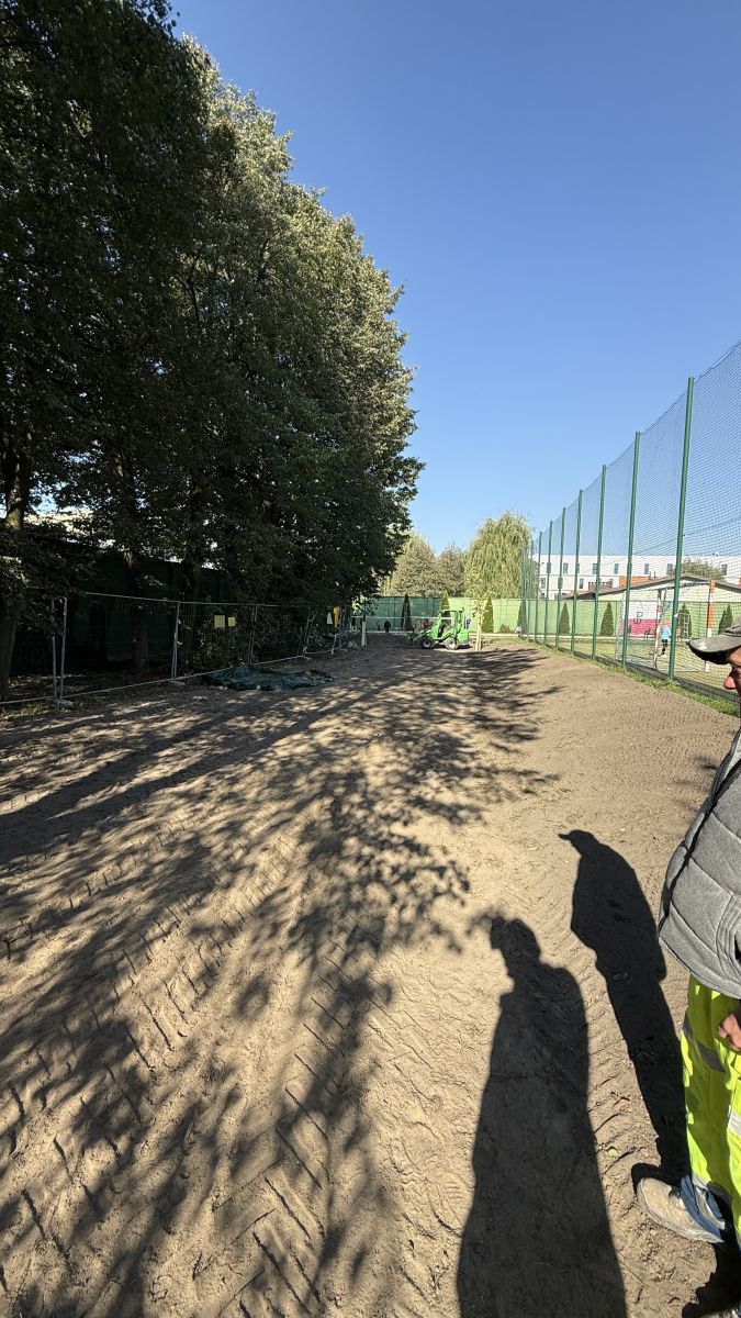 Plantowanie terenu i wyrównywanie gruntu pod ciąg pieszy w parku, przygotowanie podłoża po pracach ziemnych z użyciem sprzętu budowlanego