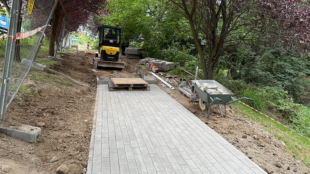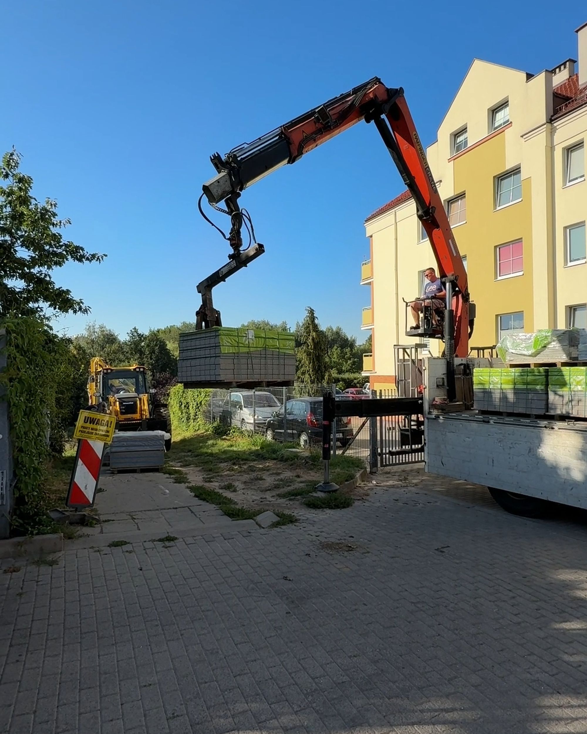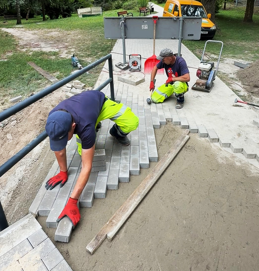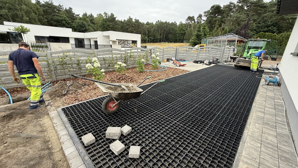 - Dodatkowe elementy – montaż studzienek, odwodnień liniowych, schodów czy murków oporowych