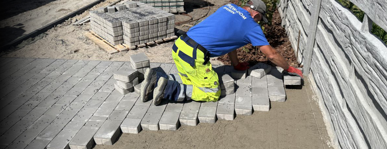 - Profesjonalne układanie kostki – układamy nawierzchnię z precyzją, dbając o wzór i właściwe spadki